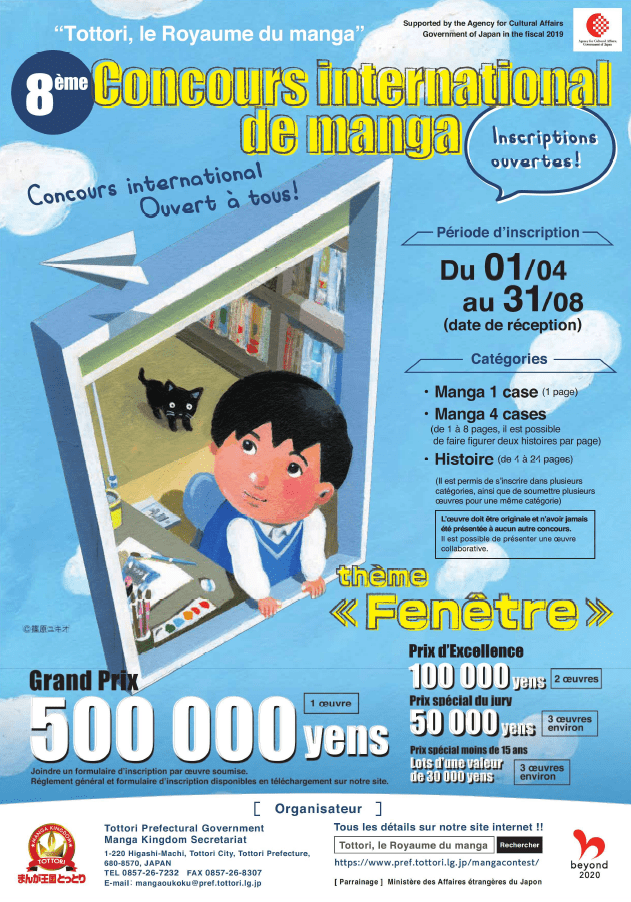 La préfecture de Tottori célèbre pour ses fameuses dunes organise jusqu’au 31 août son 8ème concours international de manga ouvert à tous les publics. Le thème choisi cette année est « la fenêtre ». Trois catégories sont proposées pour concourir: