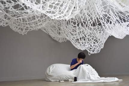 « Le corps replié sur lui-même dans son minuscule atelier, Rieko Koga brode patiemment, sur des kilo-mètres de tissu, ses pensées les plus profondes et les prières qu’elle adresse au monde et aux êtres chers. Héritière de l’art du Sashiko, broderie traditionnelle enseignée par sa mère, l’artiste japonaise pratique un don de soi spirituel et poétique, qu’elle projette tout l’été dans l’espace de la Fondation.