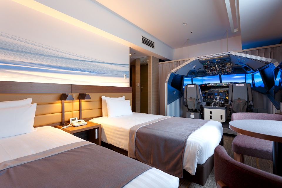 Parmi les nouveautés, l’hôtel Haneda Excel Hotel Tokyu propose une chambre avec un véritable simulateur de vol de Boeing 737 – 800. La chambre a été réalisée pour célébrer le 15ème anniversaire de l’hôtel.