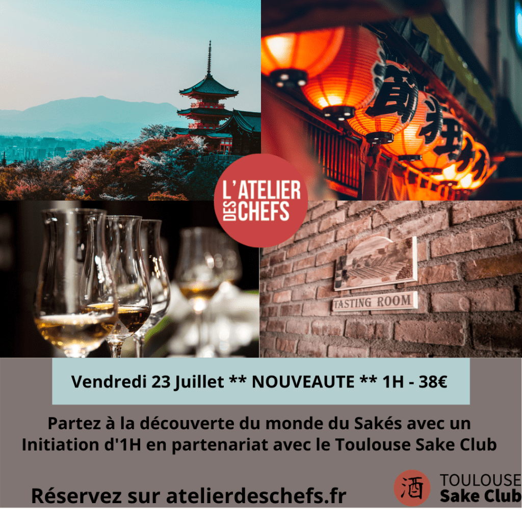 Retrouvez le Toulouse Saké Club à l’Atelier des Chefs Toulouse pour une initiation d’une heure au saké japonais avec accords le vendredi 23 juillet à 20h. Formule découverte de trois sakés et accords 38€. Informations et réservations.