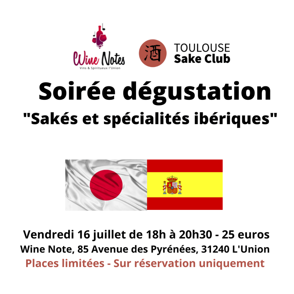 Le premier événement est une nouvelle soirée dégustation de sakés « Sakés et spécialités ibériques » chez Wine Notes à L’Union le vendredi 16 juillet de 18h à 21h.